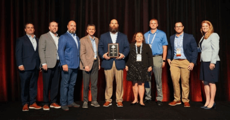 Onstage left to right: Brian Lynch, Executive Director CEBA & EVP Business Development GCCA; James Rogers, VP Business Development, GCCA; Sam Tippmann, Chairman CEBA & Founder/CEO TI Cold; Wyatt Payne Senior Vice President, Food Logistics Division, Stellar; Daryl Wolfenbarger, Project Manager, Americold; Kimberly Stanton, Project Manager, Stellar; Nathan Kendall, Project Manager, Stellar; Justin Eason, Operations Manager, Stellar; and Sara Stickler, President and CEO, GCCA. To learn more about the project, click HERE